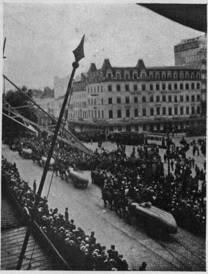 The picture upon which we looked was indeed remarkable. Belgium had been "safeguarded" from aggression, by treaties with the most civilised nations of the world. But here now were the legitimate inhabitants of the capital of Belgium standing in their thousands, gazing helplessly, in dumb bewilderment, whilst the army of one of these "most civilised" Governments streamed triumphantly, as conquerors, through their streets. And in all those streets, the only sounds were the clamping feet of the marching infantry, the clattering hoofs of the horses of the proud Uhlans and Hussars, and the rumbling of the wagons carrying murderous guns.