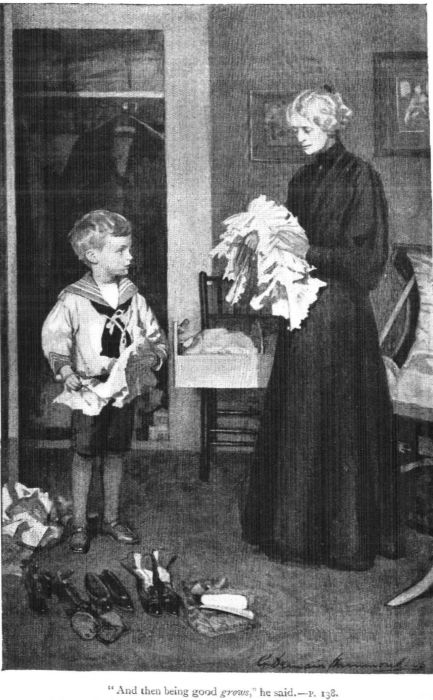 “Everything’s so tirin’, Mumsey darlin’,” he said, “and Lelly and Chrissie does spoil me so. They’se always fetchin’ my fings, and they won’t never let me run messages, scarcely. But please, Mumsey darlin’, might I not go out a walk to-day, but just stay here ’aside you?”