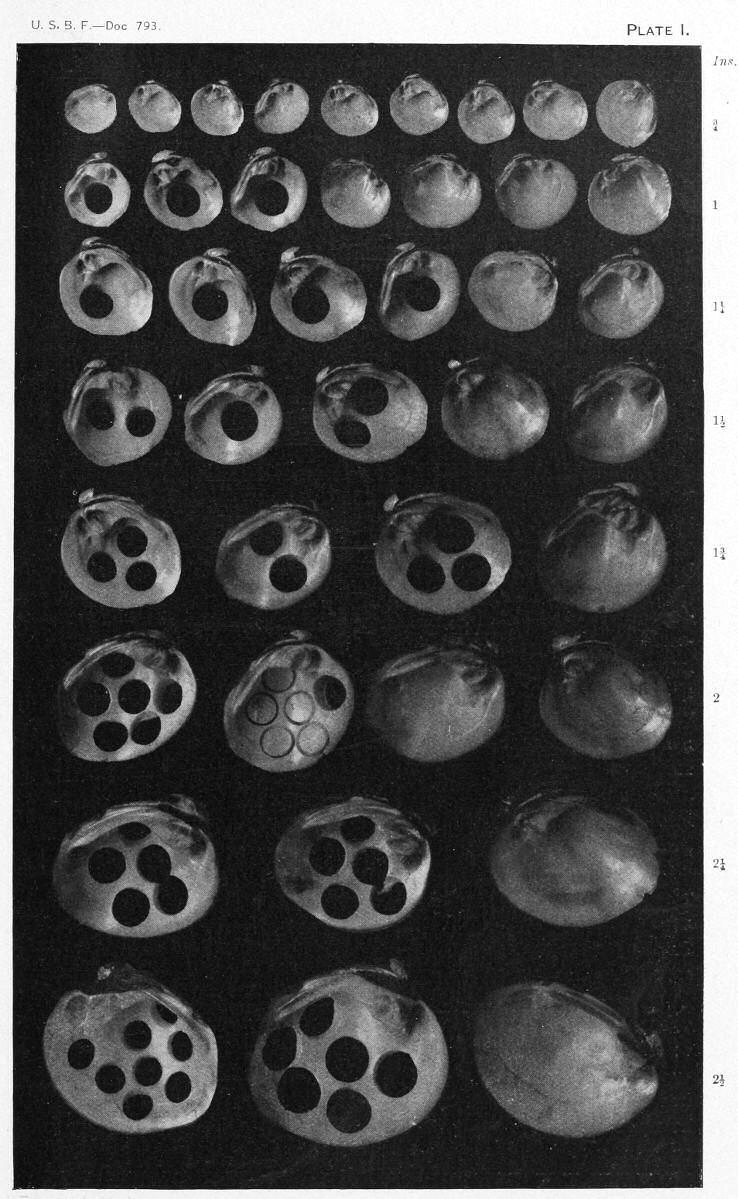 The necessity for imposing restrictions upon the size of mussels to be removed from the beds is brought out more clearly by the photographs than could be done by any lengthy discussion. All of the shells shown in plates I and II were actually taken for market, sold, and shipped to the factory. The smallest ones (in the three upper rows on plate I) were not wanted at any factory; they were bought only because the fishermen had thrown them into the piles along with the larger shells, "to add weight." Most of the very smallest shells, those under 1 inch in length, are subsequently lost in handling, by falling through the forks or otherwise wasting as they are thrown into the car or from the car to the bin. None of the shells in the three upper rows of plate I would ordinarily be used by any manufacturer. It is true that some of the shells shown [13]have had one blank cut out, and these were actually cut at a commercial plant, but the instance was a very rare one and was certainly unprofitable. Even if the manufacturer desired it, the cutters will not handle shells from which only one blank can be cut, since the waste of time outweighs the saving of material.