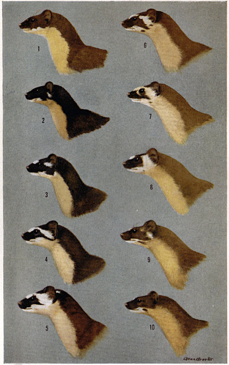 Coloration of head and foreparts in ten subspecies of long-tailed weasel, Mustela frenata. All figures are of males, approximately × 1/2.