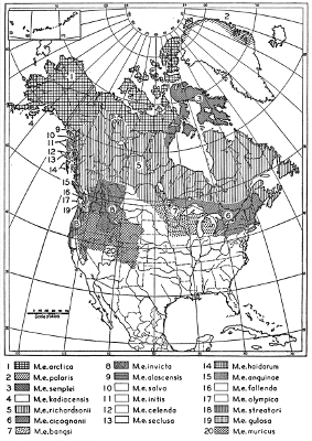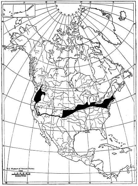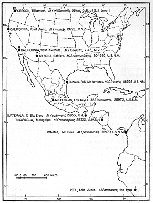 In America the subgenus Mustela occurs from the northernmost land in Arctic America southward to Lake Titicaca in the Andes of South America, a distance of approximately 6900 miles. Felis, I think, is the only other genus of land mammals in the western hemisphere that has a geographic range as extensive from north to south. Felis does not range so far north but does range farther south. The one species, Mustela frenata, ranges from Lake Titicaca northward to about 57° N in British Columbia or for approximately 5000 miles in a north to south direction and from within the Alpine Arctic Life-zone through the Tropical Life-zone. In North America, weasels occur in almost every type of habitat, being absent only in the extremely desert terrain of western Arizona and western Sonora and in adjoining parts of California and Baja California. Even this area, along the Colorado River, may support some weasels; evidence suggesting that it does so is given in the account of Mustela frenata neomexicana.