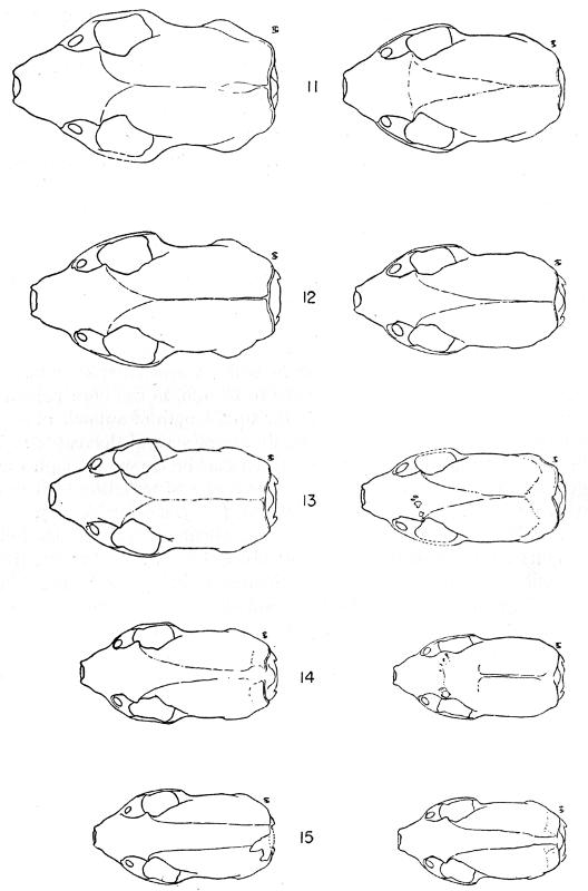 Of the vertebrae, only the cervicals, of which there are 7, were found to be constant in number. In M. erminea, two of the seven individuals in which the anticlinal vertebra was the 12th (instead of the 11th) had 15 instead of the customary 14 thoracic vertebrae. In M. frenata, seven of the twenty-seven individuals in which the anticlinal vertebra was the 12th (instead of the 11th) had 15 instead of 14 thoracic vertebrae. The one M. erminea with a pseudosacral vertebra had only two instead of the customary 3 sacral vertebrae but the same individual had 15 thoracic vertebrae. Of the six M. frenata with a pseudosacral vertebra, two animals had only two instead of three sacral vertebrae. Conceivably, therefore, the pseudosacral vertebra in each of the three instances mentioned may represent merely an unfused sacral vertebra, instead of a true pseudosacral as occurs in four individuals of M. frenata.
