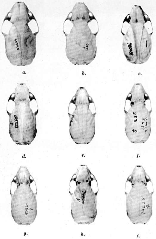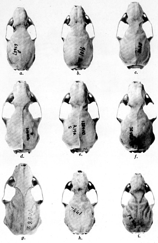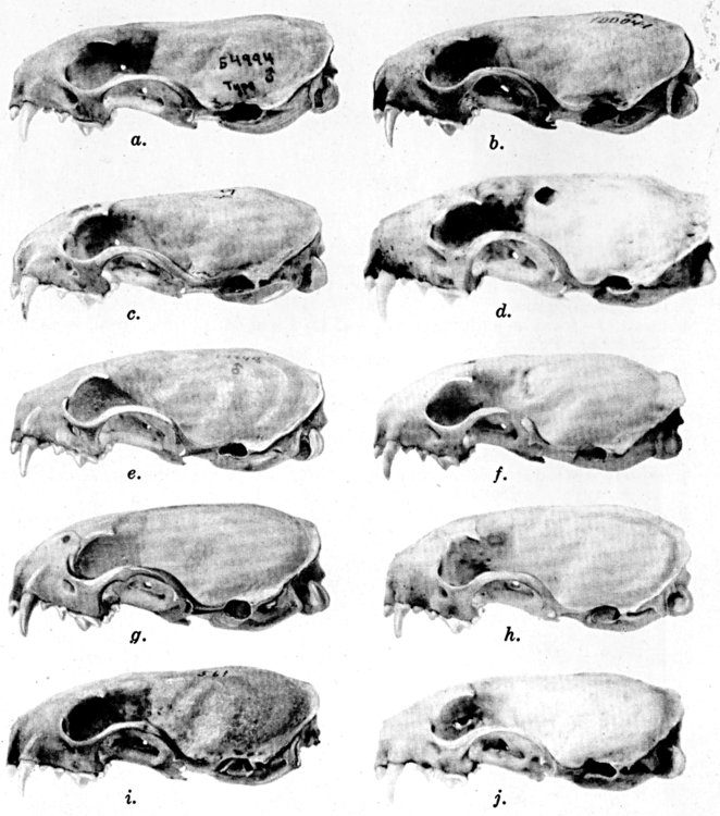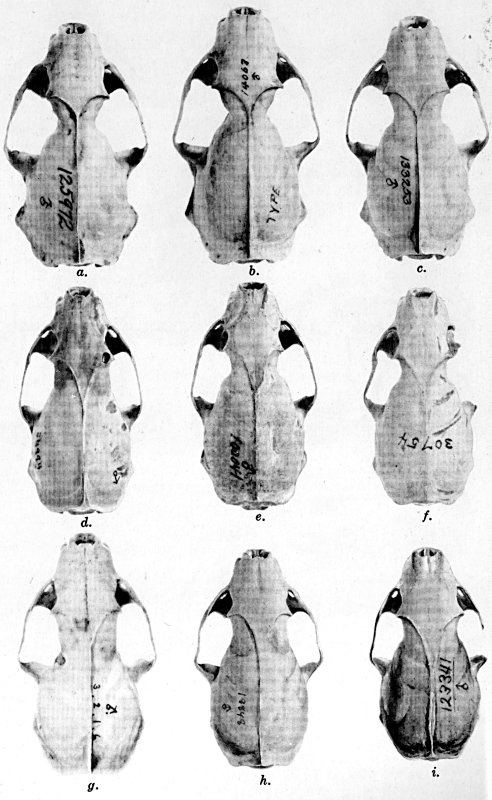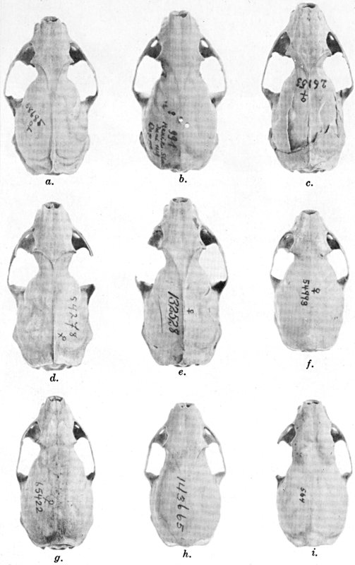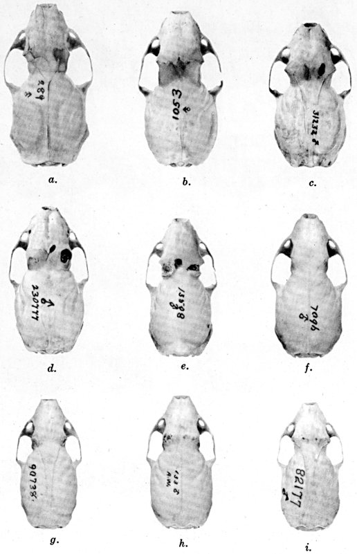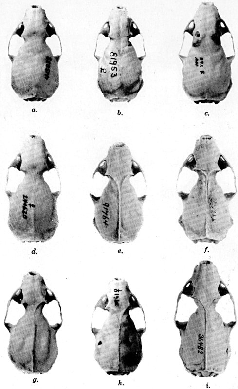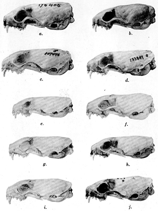 As shown by rearing mammals from humid regions in arid regions, and vice versa, the color is not visibly altered in one or a few generations; the color is an hereditary character. Beginning with the southernmost subspecies (fig. 1) and continuing northward to the northern subspecies (fig. 10) there is a darkening, next a lightening, and finally a darkening closely conforming to amounts of precipitation in the geographic regions concerned. A fuller discussion of this correlation is given on page 51.