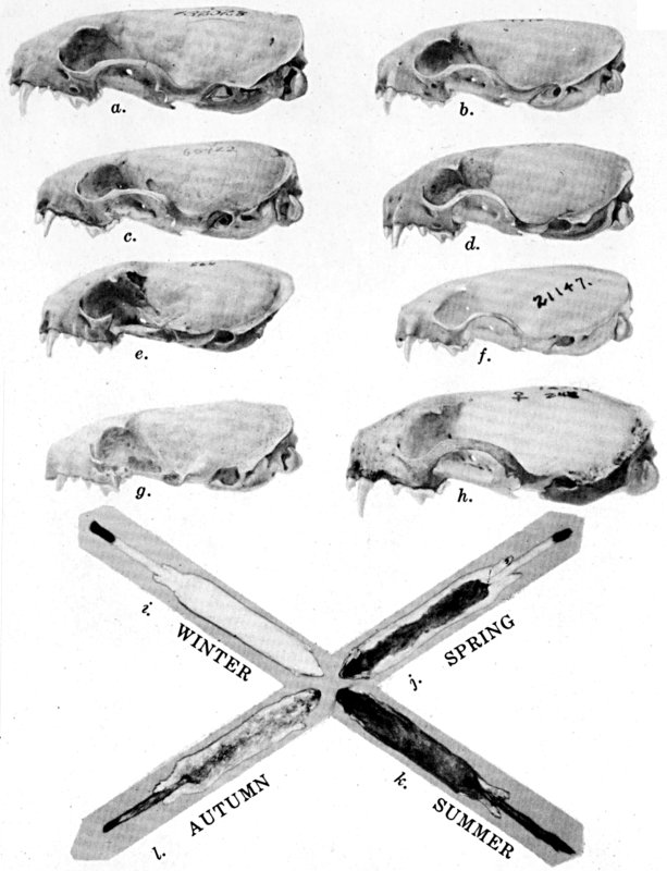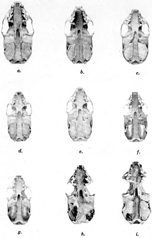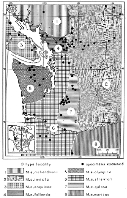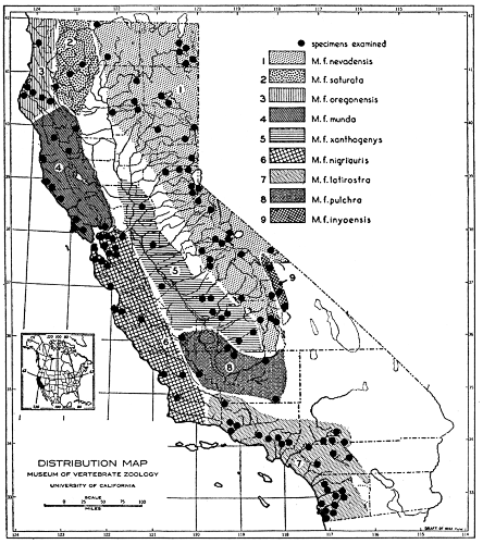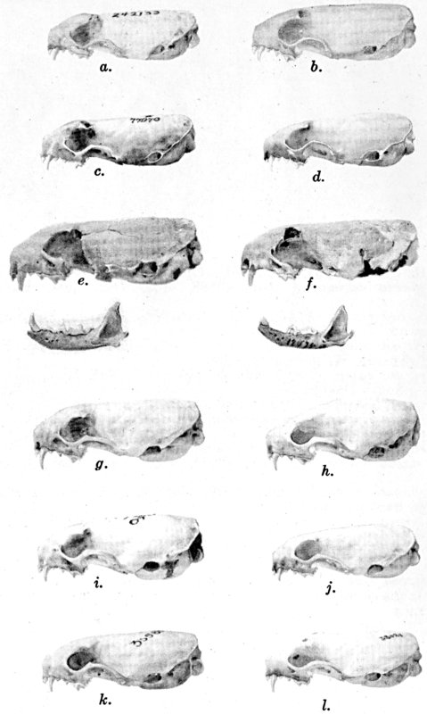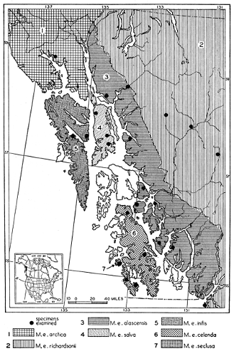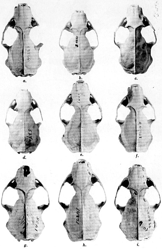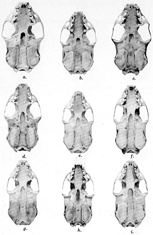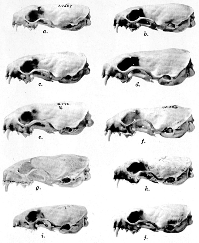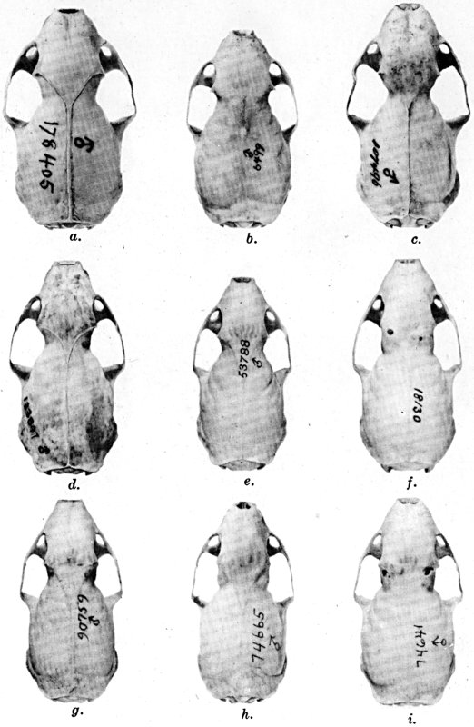 As shown by rearing mammals from humid regions in arid regions, and vice versa, the color is not visibly altered in one or a few generations; the color is an hereditary character. Beginning with the southernmost subspecies (fig. 1) and continuing northward to the northern subspecies (fig. 10) there is a darkening, next a lightening, and finally a darkening closely conforming to amounts of precipitation in the geographic regions concerned. A fuller discussion of this correlation is given on page 51.