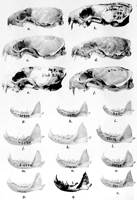 Variation according to the species is evident in the number of caudal vertebrae, but in the other categories of vertebrae no consistent difference in number according to species was found in the material examined. Apparently there is also some geographic variation in the number of caudal vertebrae within a species. For example, the one skeleton seen of Mustela rixosa eskimo (no. 219036, U. S. Nat. Mus., from St. Michaels, Alaska) has only 11 caudal vertebrae, whereas in the 11 Mustela rixosa rixosa from Roseau County, Minnesota, the usual number is 15 with extremes of 14 and 16. Similarly specimens of Mustela frenata from Idaho and California almost always have 1 or 2 more caudal vertebrae than do individuals of the shorter-tailed subspecies of the same species from eastern Kansas.