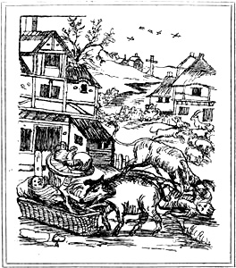 A Swiss jurist, Eduard Osenbrüggen (Studien zur deutschen und schweizerischen Rechtsgeschichte. Schaffhausen, 1868, p. 139-149), endeavours to explain these judicial proceedings on the theory of the personification of animals. As only a human being can commit crime and thus render himself liable to punishment, he concludes that it is only by an act of personification that the brute can be placed in the same category as man and become subject to the same penalties. In support of this view he refers to the fact that in ancient and mediæval times domestic animals were regarded as members of the household and entitled to the same legal protection as human vassals. In the Frankish capitularies all beasts of burden or so-called juments were included in the king’s ban and enjoyed the peace guaranteed by royal authority: Ut jumenta pacem habent similiter per bannum regis. The weregild extended to them as it did to women and serfs under cover of the man as master of the house and lord of the manor. The beste covert, to use the old legal phraseology, was thus invested with human[Pg 11] rights and inferentially endowed with human responsibilities. According to old Welsh law atonement was made for killing a cat or dog belonging to another person by suspending the animal by the tail so that its nozzle touched the ground, and then pouring wheat over it until its body was entirely covered. Old Germanic law also recognized the competency of these animals as witnesses in certain cases, as, for example, when burglary had been committed by night, in the absence of human testimony, the householder was permitted to appear before the court and make complaint, carrying on his arm a dog, cat or cock, and holding in his hand three straws taken from the roof as symbols of the house. Symbolism and personification, as applied to animals and inanimate objects, unquestionably played an important part in primitive legislation, but this principle does not account for the excommunication and anathematization of noxious vermin or for the criminal prosecution and capital punishment of homicidal beasts, nor does it throw the faintest light upon the origin and purpose of such proceedings. Osenbrüggen’s statement that the cock condemned to be burned at Bâle was personified as a heretic (Ketzer) and therefore sentenced to the stake, is a far-fetched and wholly fanciful explanation. As we have already seen, the unfortunate fowl, suspected of laying an egg in violation of its nature, was feared as an abnormal, inauspicious, and therefore[Pg 12] diabolic creature; the fatal cockatrice, which was supposed to issue from this egg when hatched, and the use which might be made of its contents for promoting intercourse with evil spirits, caused such a cock to be dreaded as a dangerous purveyor to His Satanic Majesty, but no member of the Kohlenberg Court ever thought of consigning Chanticleer to the flames as the peer of Wycliffe or of Huss in heresy.