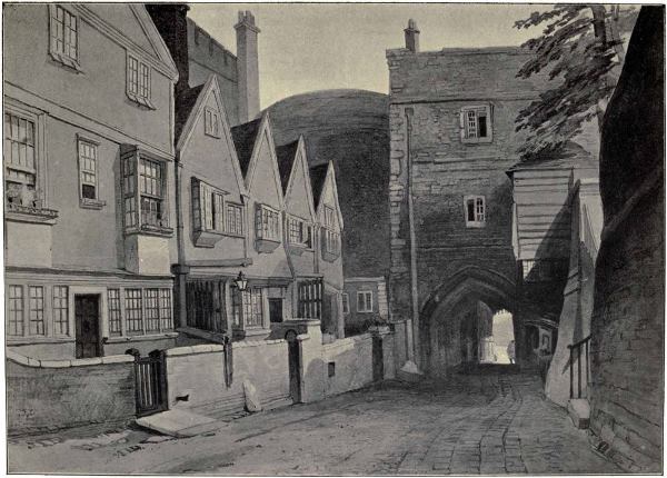 First. We have the Tower on the east side, guarding the approach from the sea, and the high and spacious wall surrounding the whole city. Fitzstephen, a monk of Canterbury, gives an interesting picture of the times of Henry II. He describes London as bounded on the land side by a high and spacious wall, furnished with turrets and double gates. These were Aldgate, Bishopsgate, Cripplegate, Aldersgate, Newgate, Ludgate, and probably Bridgegate. But see Stow’s comment (Ed. Thoms, 1842, page 11). There was also a postern near the Tower. The latter he calls “the Tower Palatine,” and also names “two castles well fortified” in the west, Baynard and Montfichet. The former stood at the western extremity of the city wall on the site of the present Castle Baynard Wharf, and adjoining Carron Wharf. The name survives also in the name of “Castle Baynard Ward.” It was built by Baynard, a follower of William the Conqueror, and though it was burnt more than once, it was duly restored, and lasted till the Great Fire. It became a Royal palace, and in it Edward IV. assumed the title of King. Henry VIII. made it one of his residences. So did Edward VI., on whose death Queen Mary was here proclaimed Queen. Montfichet Tower was between the site of Ludgate Hill Station and Printing House Square. A bastion of the London Wall still remains in the churchyard of St. Giles’, Cripplegate.