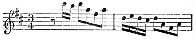 [78] Our readers will remember the familiar case in Schumann’s pianoforte quartet, where he lowers the C string to B♭ for a particular effect. De Beriot raises his fourth (violin) string to A for certain passages.