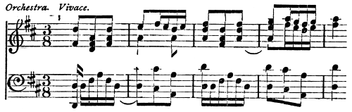 [28] Vivaldi takes an important place as one of those who studied and brought forward form. He wrote concertos for one, two, three and four solo violins, improved the orchestra, and invented new means of expression. He died in 1743 at Venice. See Spitta, vol. i. p. 411.