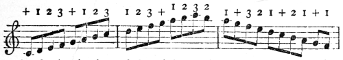 [77] In “The Compleat Tutor for the Harpsichord or Spinnet, wherein is shown the Italian manner of Fingering, &c.” by S. and S. Thompson, the date of which is later than 1742, since it contains the minuet in Samson, the little finger is never used in a scale, and fingers are made to go under one another, in the way the thumb is used nowadays. The English numbering is used; and the example of an ascending and descending scale on p. 153 shows the chaotic condition of things.