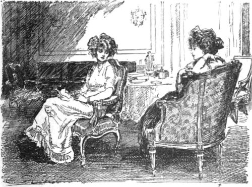 She had cast aside her furs and was resting on one elbow, twisting her handkerchief to rags between her gloved hands, and staring at the fire. One or two tears gathered and fell.
