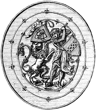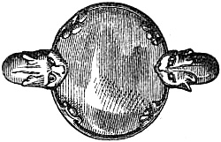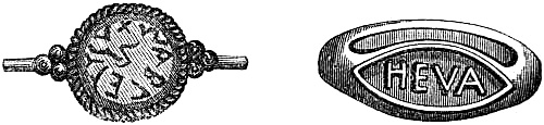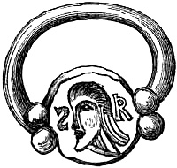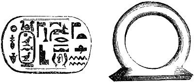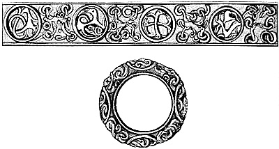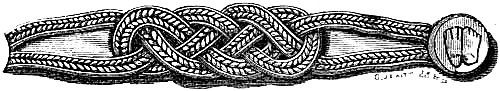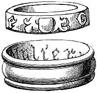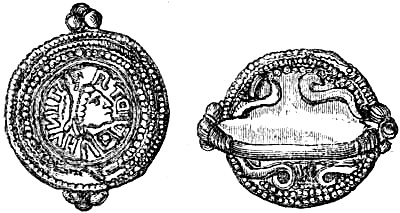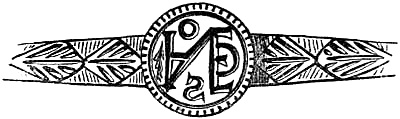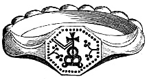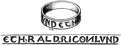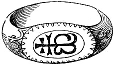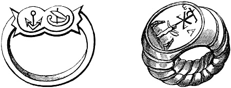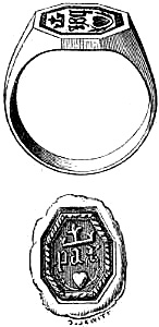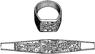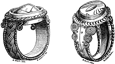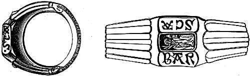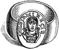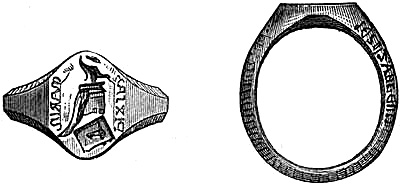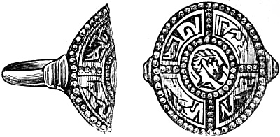 [70] This great founder of the Merovingian dynasty, the father of Clovis, died in 482, and was buried with his treasures, weapons, and robes. Nearly twelve hundred years afterwards, a labourer, a poor deaf and dumb man, accidentally discovered the royal grave, and was astonished, and almost terrified, at the sight of the treasures it contained. Among them was the signet-ring alluded to, which, with a considerable number of the other treasures of the tomb, were deposited in the Bibliothèque, then ‘Royale,’ at Paris, which was broken into by burglars in 183-. An alarm being given, in their hasty flight they threw the objects into the Seine; the ring was not recovered.
