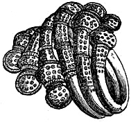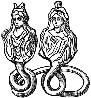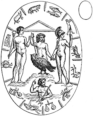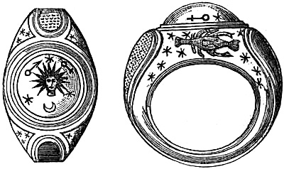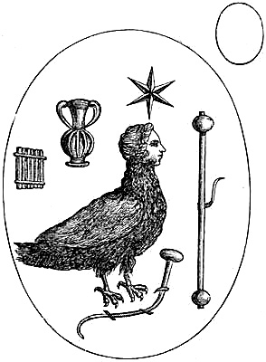 [37] Abraxas-stones were so called from having the word Abraxas or Abrasax engraved on them. They are cut in various forms, and bear a variety of capricious symbols, mostly composed of human limbs, a fowl’s head and serpent’s body. These gems are represented as coming from Syria, Egypt, and Spain. It is certain that the use of the name Abraxas was at first peculiar to the Gnostic sect of the Basilideans. There is little doubt that the greater part of the Abraxas-stones were made in the Middle Ages as talismans.