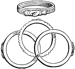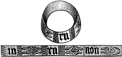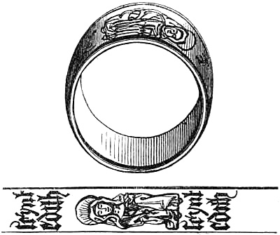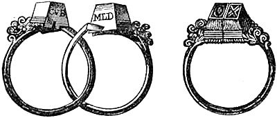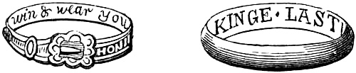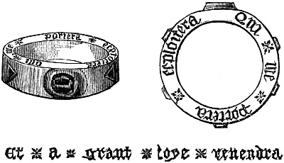 [71] I am greatly indebted to this gentleman for the loan of a manuscript catalogue of ring mottos and inscriptions on wedding-rings, of which—besides those exhibited at the Kensington Museum—I have availed myself in the following pages of this chapter. Mr. Singer has, I believe, the finest collection of inscribed wedding-rings known, numbering two hundred and forty-five specimens of every kind, in gold and silver, each weighing from three dwts. and upwards, and none less than a hundred years old, some dating from five hundred years.