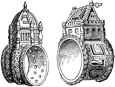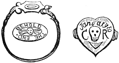 [68] ‘The skull and skeleton decorations for rings’ (remarks Mr. Fairholt) ‘first came into favour and fashion at the obsequious court of France, when Diana, of Poictiers, became the mistress of Henry the Second. At that time she was a widow, and in mourning, so black and white became fashionable colours; jewels were formed like funeral memorials; golden ornaments, shaped like coffins, holding enamelled skeletons, hung from the neck; watches, made to fit in little silver skulls, were attached to the waists of the denizens of a court that alternately indulged in profanity or piety, but who mourned show.’