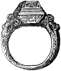 [51] In the ‘Archæologia,’ vol. xxxvi., Mr. Octavius Morgan remarks ‘that in the beginning of the seventeenth century some attention seems to have been paid to the subject of rings in general, and several persons wrote concerning them. John Kirchmann, a learned German of Lubeck, published a treatise “De Annulis;” and about the same time Henry Kornmann wrote another small treatise “De Triplici Annulo.” Kirchmann appears to have made deep researches on the subject, and in the chapter on “Episcopal Rings” he gives their history as far as he was able to trace it, though he cannot find in ancient writers any facts relating to them earlier than the reign of Charlemagne. In gratitude to this monarch for the important services he had rendered the Church, it was decreed in the eighth century that the Emperor should have the power of electing the Popes and ordering the Holy See, and that in addition the archbishops and the bishops of the provinces should receive investiture from him. No newly-elected prelate could be consecrated until he received from the Emperor the ring and the staff; these were to be returned on the death of the prelate. But this practice was disused for a time; for we find enumerated in the old chronicles of Mayence, among the jewels in that city, “sixteen large and good pontifical rings—one of ruby, with other gems, one of emerald, one of sapphire, and one of topaz.”’