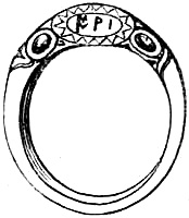 [44] Queen Bertha, consort of King Louis the Seventh, of France, was crowned by the Pope, who also placed a ring on her finger, saying: ‘Receive this ring, emblem of the Holy Trinity, by which you may resist heresy and bring the heathen to a knowledge of the faith by the virtue thus given. God, the source of all dignity and honour, give to thy servant, by this sign of the faith, grace to persevere in His sight, that she may evermore rest firm in the faith by the merits of Jesus Christ.’