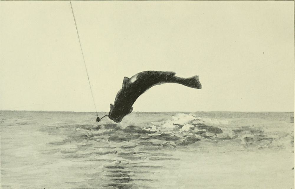 A tarpon will leap six feet high, but the[14] cero, or Florida kingfish, will leap higher, for it is the greatest vaulter of them all. The ladyfish executes a series of short, whirling leaps that puzzle the eye to follow—it is the gamest fish for its size in salt water. The leap of the flying-fish is sustained for a long distance by its wing-like pectoral fins, on the principle of the aëroplane, though its sole motive power is probably derived from its tail before leaving the water. The salt-water mullet is an expert jumper, leaping often in play, but when pursued by an enemy its leaps are higher and longer than would be expected from its size. The brook trout, pike, and mascalonge seldom leap when hooked, though the steelhead trout and grayling both leap nearly as often as the black bass in their efforts to dislodge the hook. The leap of the salmon is a long, graceful curve, as it heads up stream. Once, while playing my first salmon, on the Restigouche, many years ago, my taut line was leading straight down the stream, when I caught sight of a salmon over my shoulder and above me,[15] leaping from the surface, which, to my surprise, proved to be my hooked fish—the line making a long detour in the swift water.