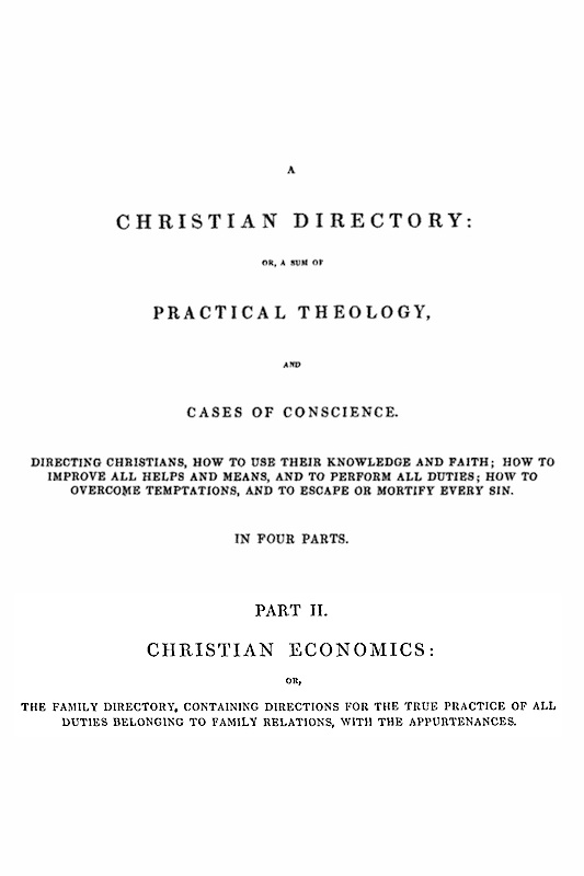 The text of Part II of A Christian Directory (or, a sum of Practical Theology and Cases of Conscience) has been transcribed from pages 394 to 547 of Volume I of Baxter's Practical Works, as lithographed from the 1846 edition. Part II addresses family duties. A table of contents has been inserted to assist the reader.