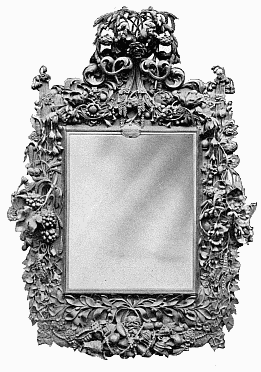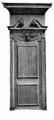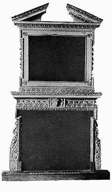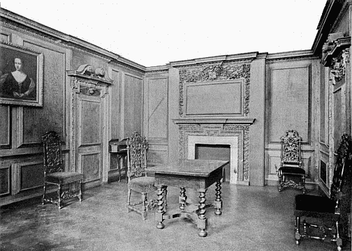 Good specimens of the wood-carving of Grinling Gibbon (born 1648, died 1721) are to be seen at Hampton Court, to which Palace William III. appointed the artist Master Carver. He generally worked in soft woods, such as lime, pear and pine, but sometimes in oak. His subjects were very varied—fruit and foliage, wheat-ears and flowers, cupids and dead game, and even musical instruments—and were fashioned with amazing skill, resource, and ingenuity. He invented that school of English carving which is associated with his name. His fancy is lavish and his finish in this particular work has never been surpassed in this country; but it is doubtful whether his work is not overdone, and as such may not appeal to the purer taste. Often his masses of flowers and foliage too much suggest the unpleasant term which is usually applied to them, viz. "swags." Frequently nothing is left to the imagination in the boldness of his realism. Fig. 1 shows a very happy example of his work over a mantelpiece in one of the smaller rooms in Hampton Court Palace, which is reproduced by the courtesy of the Lord Chamberlain, the copyright being the property of H.M. the King. Upon the shelf are pieces of china belonging to Queen Mary, but the portrait inset is of Queen Caroline, [7] consort of George IV. In the grate is an antique fire-back, and on either side of the fire is a chair of the period of William and Mary.