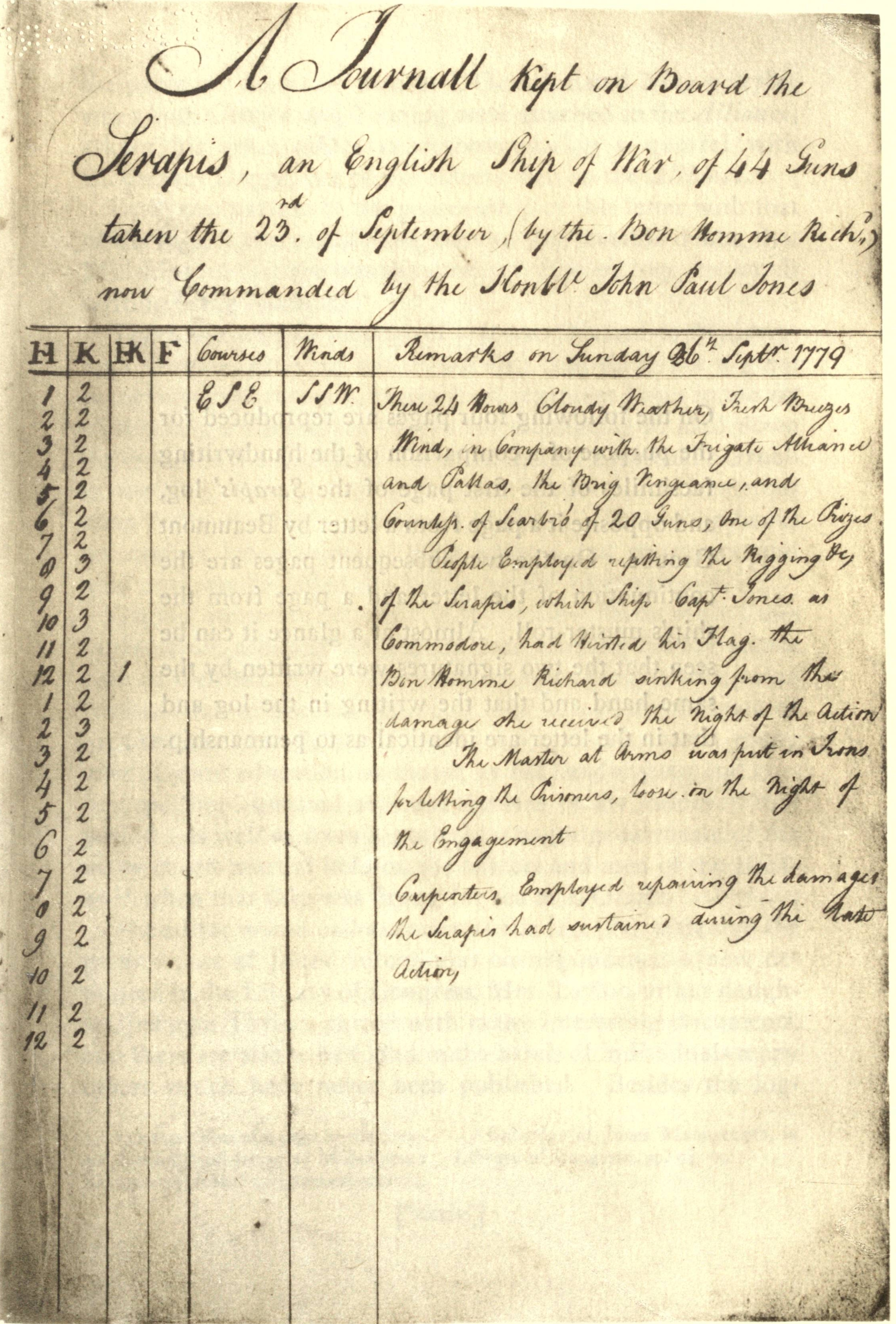 A Journall Kept on Board the Serapis, an English Ship of War, of 44 Guns taken the 23rd. of September, (by the Bon Homme Richd.,) now Commanded by the Honble. John Paul Jones 25