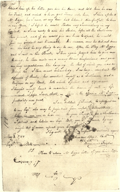 The present owner's attention was specially called to it by seeing a small photographic reproduction, published in a book by Professor Marion entitled, "John Paul Jones' Last Cruise and Final Resting Place," Washington, 1906. The author describes this valuable and historical document as a "manuscript written on two pages of rough, greenish paper, evidently torn out of a log book," and attributes it to Richard Dale, the first lieutenant of the Bon Homme Richard. The compiler of the "John Paul Jones Manuscripts" in the Library of Congress attributes it possibly to Jones' secretary.[5] The author of the (p. xvi) "Memoirs of Rear-Admiral Paul Jones," published in Edinburgh and London, 1830, Volume I, page 192, states "that the fact of Landais' firing into the Bon Homme Richard is also confirmed by the log-book, which was preserved when the ship sunk, and by a very interesting and seaman-like narrative of the engagement, drawn up by Mr. Dale." He adds in a footnote in reference to the log-book: "This battered volume, after many adventures by land and water, is now (1830) in the possession of Mr. Richard Napier, Advocate."