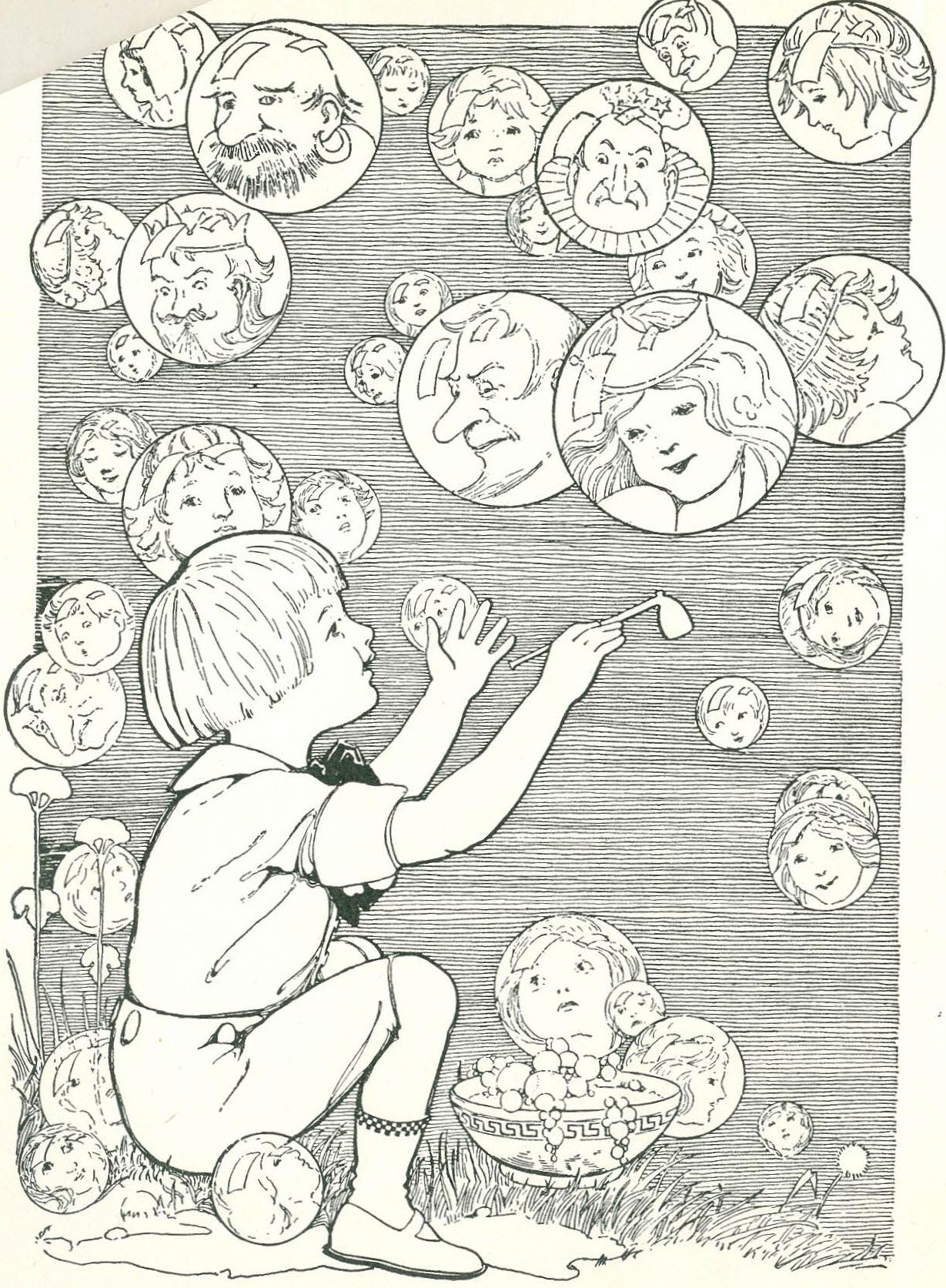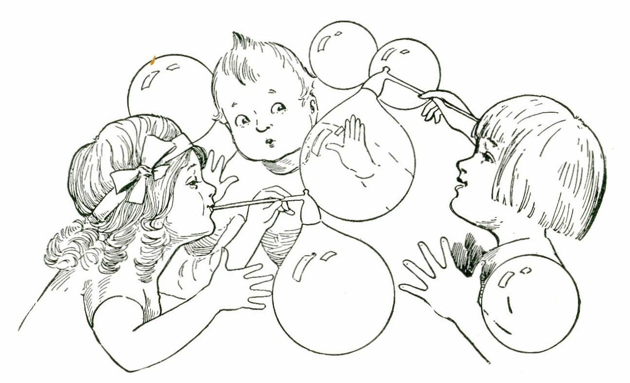 One day Bobbie and Betty and Billy were out in the garden blowing bubbles. They all blew bubbles, big ones and little ones, till evening came and it was almost time for tea. Then Billy said, “I can blow the biggest bubble anybody's blown to-day,” and blew a bubble as big as an apple.
