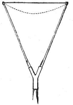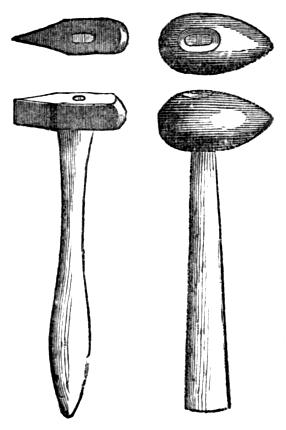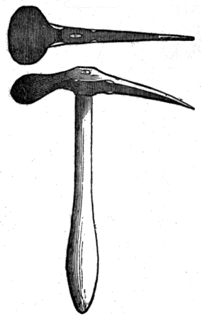 And now, as to the tools necessary to the young geologist. First of all, he cannot take too few! It is a great mistake to imagine that a full set of scientific instruments makes a scientific man. The following hammers, intended for different purposes, ought to be procured. Fig. 1 is an exceedingly useful weapon, and one we commonly use, to the exclusion of all others. It is handy for breaking off fragments of rock for examination; and, if fossils be included in them, for trimming the specimens for cabinet purposes. As a rule, however, field geologists are always divided over the merits of their hammers, some preferring one shape and some another. Fig. 2 is generally used for breaking up hard rocks, for which the bevel-shaped head is peculiarly adapted. It is usually much heavier than the rest, and is seldom used except for specific purposes. If our readers are inclined to study sections of boulder clay, and wish to extract the rounded and angular boulder from its stiff matrix, they cannot do better than use a hammer like Fig. 3. This is sometimes called the "Platypus" [8] pick. Both ends can be used, and the pick end is also good for working on soft rocks, like chalk. A little practice in the field will teach the student how to use these tools, and when, much better than we can describe on paper. The hammers can be obtained from any Scientific instrument manufacturer, or from any of the dealers in geological specimens. We have found that the best hammers for usage, however, were to be made out of an old file, softened and well welded, rolled, and then hammered into a solid mass. If properly tempered a hammer made in this fashion will last you your life.