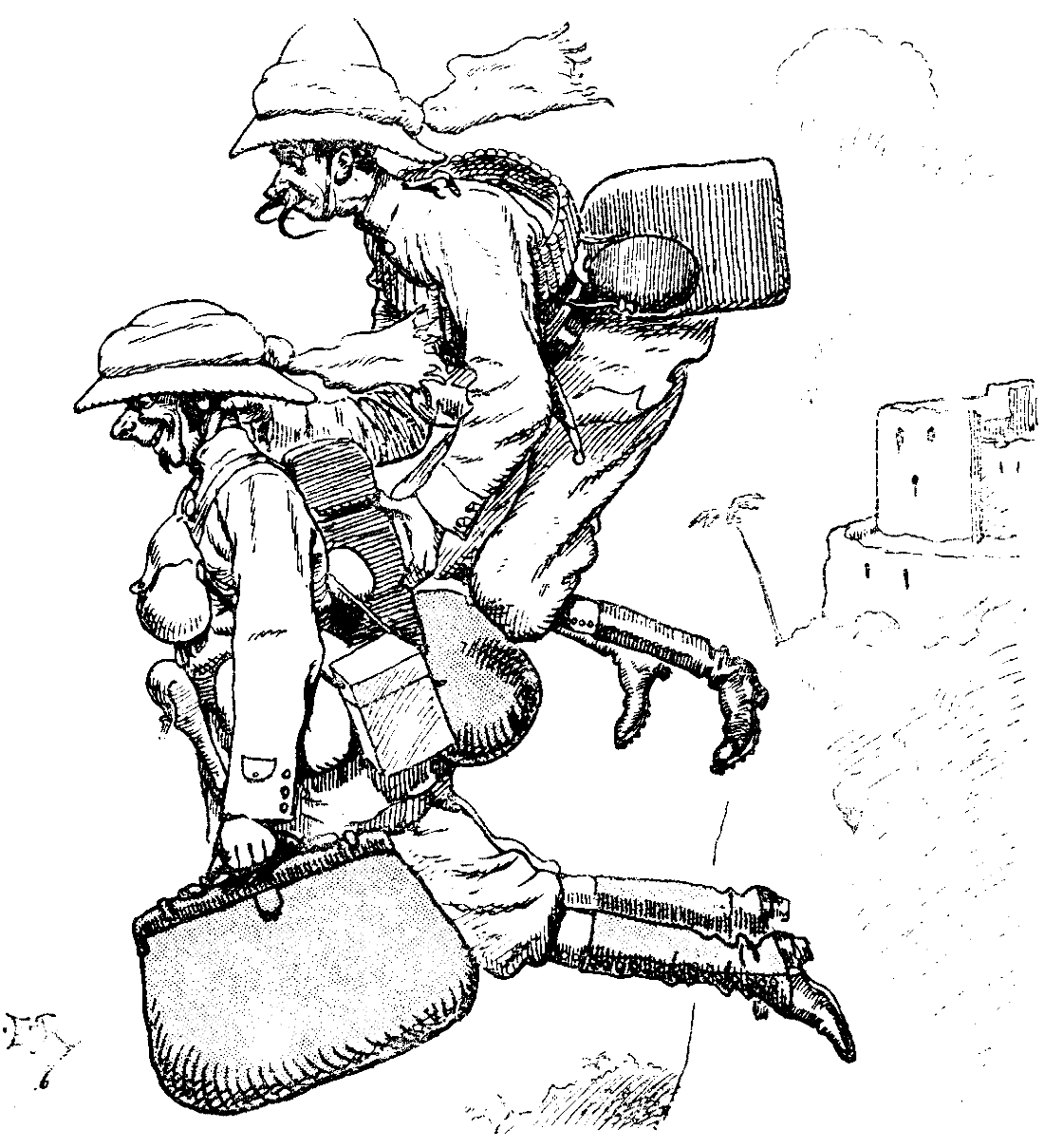 I ought to explain that, as I had expected, partly owing to the well-known laws of gravitation, partly owing to the celebrated air-wave theory, first propounded by my friend, Dr. Hasewitz, Regius Professor of Phlebotomy in the University of Bermuda, I was now proceeding in a series of gigantic serpentine curves through the air. At the moment of which I am speaking I was at the top of one of these curves, and I calculated that, with luck, I should just be able, on my downward course, to clear the western gate of the city, and then, having come to within a few feet of the ground, I should speed upward again and onward heaven knows whither. In a flash it occurred to me that if Ganderdown was ready at his appointed post beyond the gate, I might in passing be able to seize him and bear him with me in my wild flight. I pulled out my watch. The hands pointed to five minutes past twelve, and as we had fixed midnight for our meeting, I knew that my henchman, the very soul of punctuality, would be at the rendezvous. Yes, there was the faithful old fellow, armed and provisioned to the teeth, standing stolidly as was his custom, apparently paying but little attention to anything that was going on around and about him. With a rush and a swoop I was upon him. I stretched out my hand, and, as I passed, took a full and powerful grip of the collar of his coat, wrenched him from the ground, and thus accompanied went serpentining onwards into the unknown.