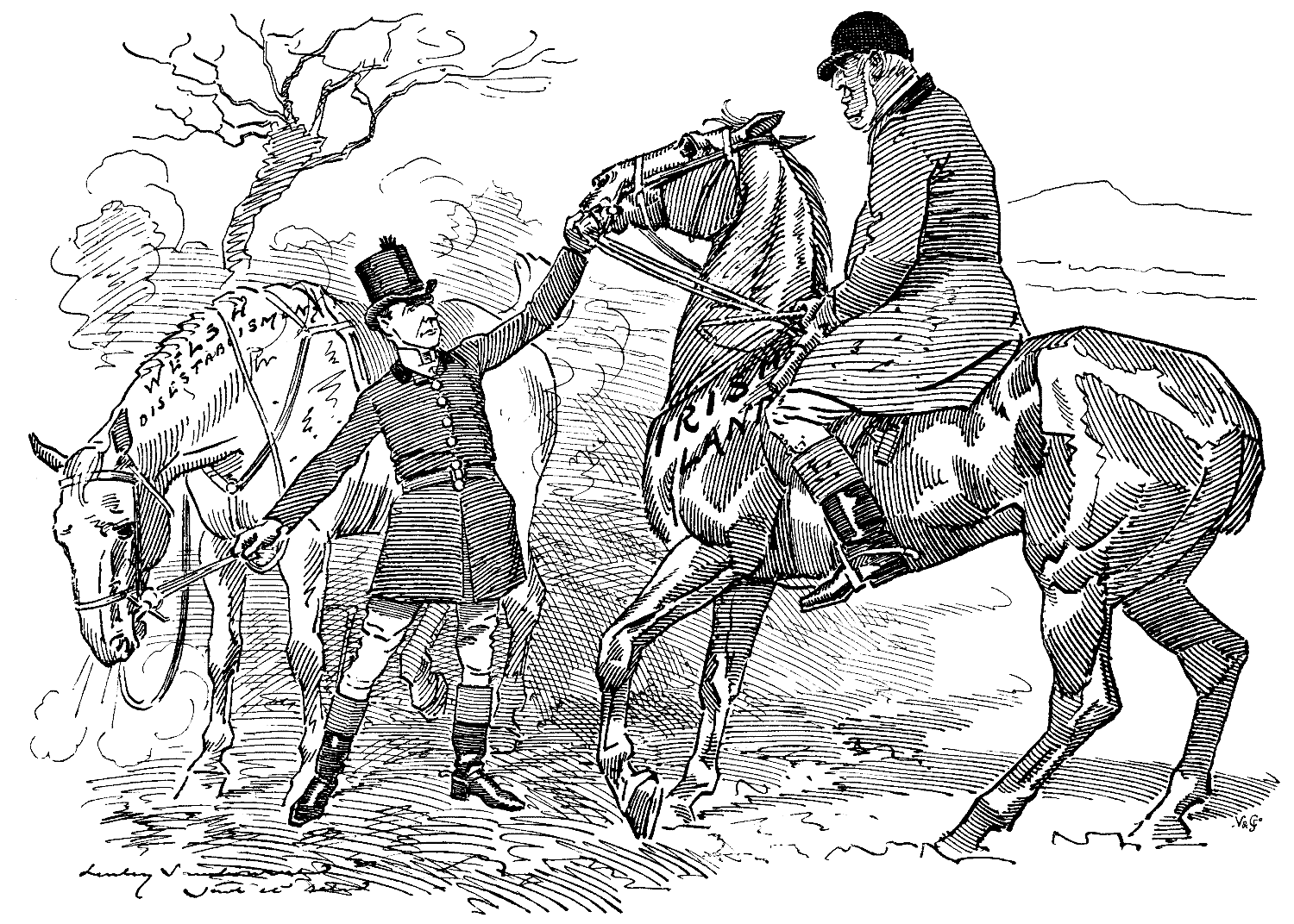 J-hn M-rl-y (the Groom, to the Noble Sportsman, Sir W. V. H-rc-rt). "You've had a bit of a spin on the Welshman, Sir, and I think you'll find the Irishman pretty fit!"