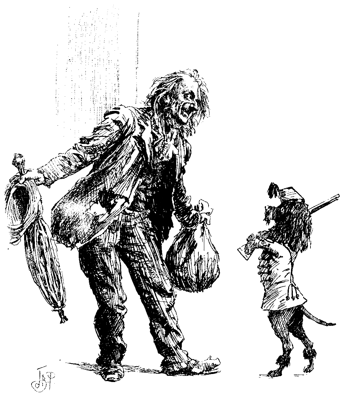 Alfred Früyseck enters, followed by Little Mopsėman on his hind legs. Alfred is a weedy, thin-haired man of about thirty-five (or thirty-six) with tinted spectacles and limp side-whiskers. Mopsėman wears a military tunic and a shako very much over one eye, and is shouldering a small toy musket. He is bandy-legged, with a broad black snout and beautiful intelligent eyes. His tail is drooping and has lost all its hair.