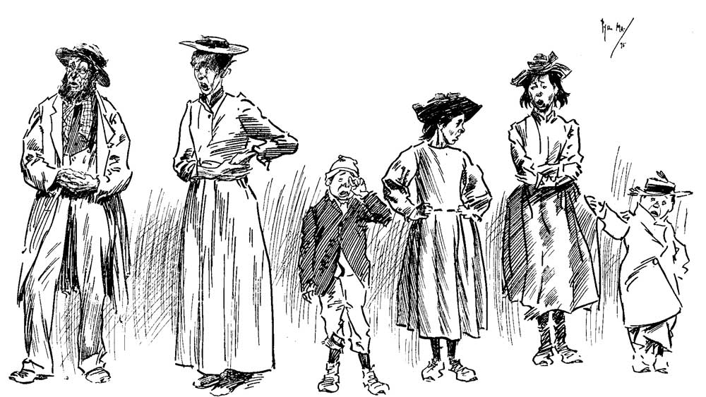 Commercial prosperity continues to attend the cheery coster as he hawks his wares about the Liverpudlian streets, and the situation is getting hawkward for the local tradesman, who declares that the itinerant vendor's opposition draws away customers from his shop. So momentous, indeed, to the welfare of the Lancastrian port has this Cockney Crusade become, that the magnates of the City Corporation assembled in Committee to discuss means for "making the coster go back to London." Among other weighty reasons for the expulsion of the intruder, it was stated that "a gentleman trod upon a banana peel the other day, and fell." Whether the peel was deposited by an offending coster, or by one of the many bare-footed but picturesque and ingenuous youths of the town, history does not relate. However, the great gravity of the crisis may be understood when, towards the end of the debate on the question, we are told that the chairman observed that, "if this thing was allowed to go on, perhaps a certain alderman and himself would start a barrow with a picture on it, and go about selling fine arts." Chorus of aldermen:—