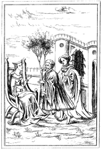 La reine, à cette nouvelle épreuve, voulut s'élancer et suivre dans le lac la demoiselle: mais le valet qui s'était hâté de revenir la retint de force; elle s'étendit sur l'herbe, perdue dans les sanglots. En ce moment vint à passer près de là une abbesse accompagnée de deux nonnes, d'un chapelain, d'un frère convers[7] et de deux écuyers. Des cris frappant son oreille, elle se détourna pour aller vers le point d'où ils partaient. Quand elle vit la reine: «Dieu, madame, vous donne joie! dit-elle.—Hélas, il n'est pas en son pouvoir de consoler la plus malheureuse femme du monde. J'ai perdu toutes les joies, tous les honneurs.—Dame, qui êtes-vous donc?—Une dolente qui a trop vécu.» Le chapelain tirant alors l'abbesse par la guimpe: «Croyez-moi, madame, dit-il, cette dame est (p. 17) la reine.» L'abbesse ne put retenir ses larmes. «Pour Dieu! madame, lui dit-elle, veuillez ne rien me cacher, je le sais, vous êtes la reine.—Oui, oui, la reine aux grandes douleurs.» Cette réponse a fait que la première branche de notre histoire est ordinairement appelée l'Histoire de la Reine aux grandes douleurs.