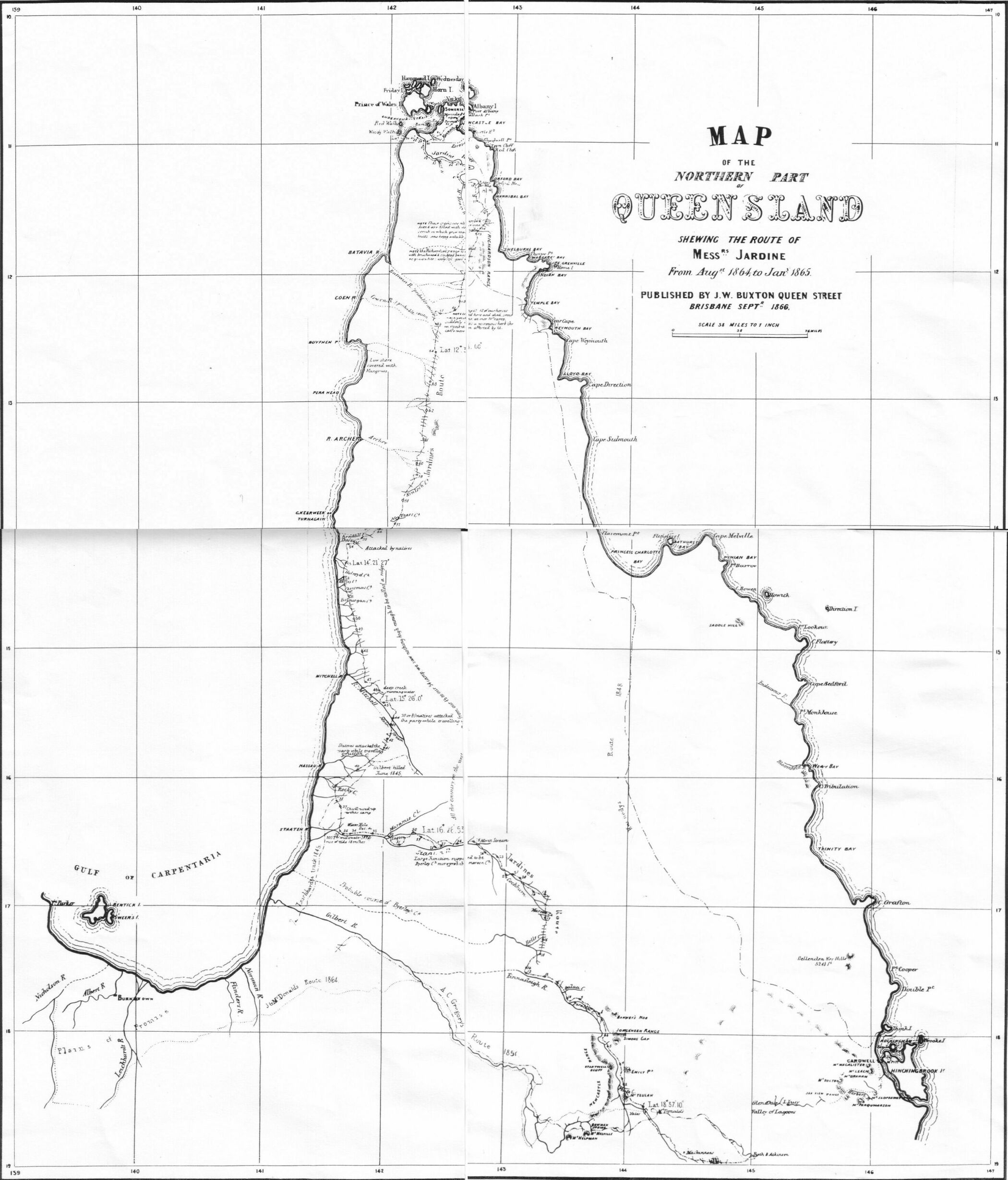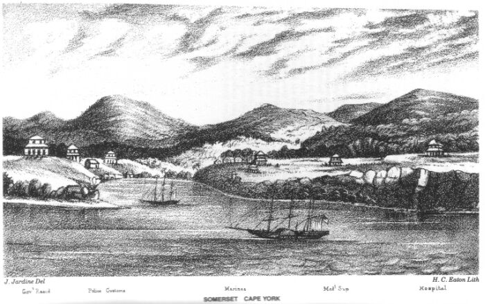 On the 14th of May, 1864, the overland party which was to take cattle to the new settlement at Cape York, was started by Mr. Frank Jardine, from Rockhampton, under the charge of his brother Alexander. It comprised ten persons, with thirty-one horses. The instructions were to travel by easy stages to Port Denison, and there wait the arrival of the Leader. In the following month, Mr. Jardine, senior, taking with him his third son John, sailed for Brisbane, and shortly after from thence to Somerset, Cape York, in the Eagle, barque, chartered by the Government, for transport of material, etc., arriving there at the end of June.