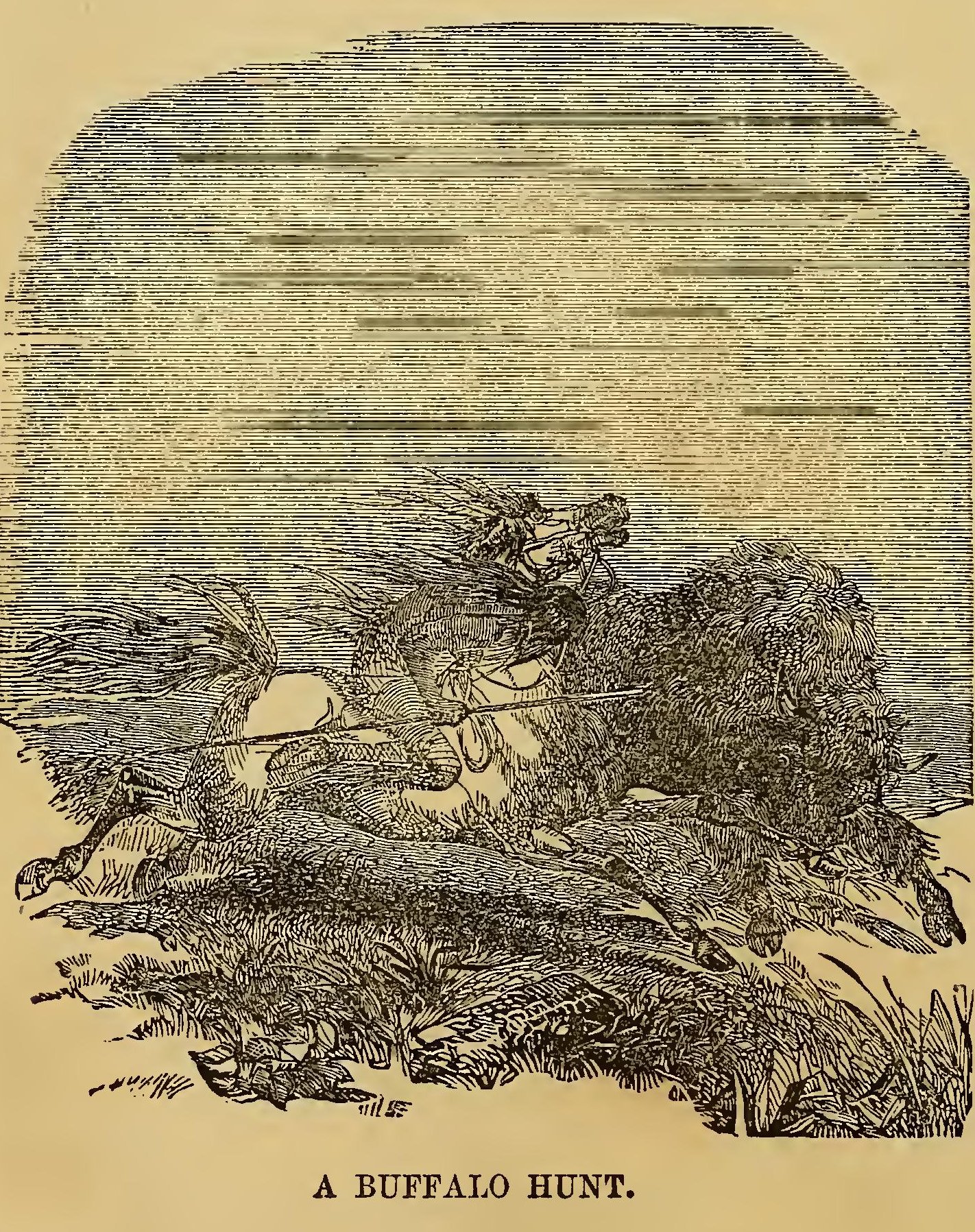 HE buffalo hunt, next to the Indian battle, is the most intensely exciting scene which may be witnessed among the wilds of the west. To the buffalo, the Indian looks for food, for clothing, and for religious and household implements. He regards the hunting of that animal not only as a pleasure, but a duty; and when once it is rumored through a village that a herd of buffalo is in sight, their warriors who have faced death in a hundred forms, bring out their swiftest horses, and spring upon them; and when the whole party rush across the field eager to engage the bellowing herd, a scene is presented for which it would be in vain to look for a parallel, even among the cane-brakes of Africa, or the jungles of India.
