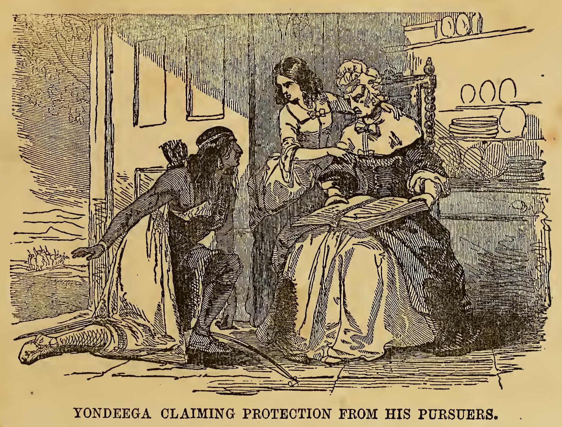 When the Indians arrived in sight of the English camp, Wanou showed the young officer his countrymen, observing his countenance the while. “There are thy brethren,” said he, “waiting to fight us. Listen to me. I have saved thy life. I have taught thee to make a canoe, and bow and arrows; to hunt the bear and the buffalo; to bring down the deer at full speed, and to outwit even the cunning fox. What wast thou when I first led thee to my wigwam? Thy hands were like those of a child; they served neither to support nor to defend thee; thou wert ignorant, but from me thou hast learned every thing. Wilt thou be ungrateful, and raise up thy arm against the red man?”