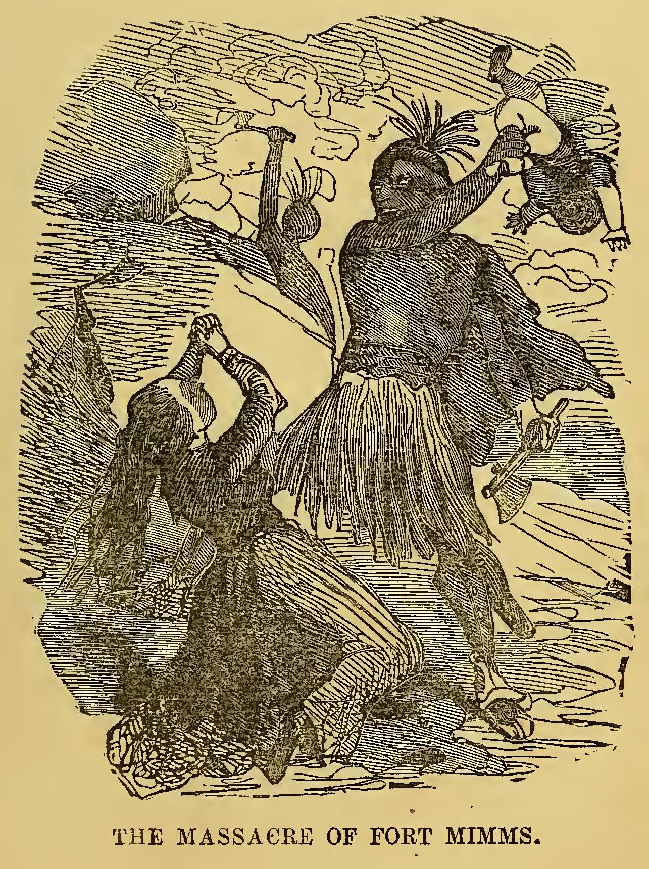 As one of them rushed toward him, gun in hand, he sprang into his wheat-field and endeavored to conceal the direction he took. A volley of musketry followed him, and he was wounded, yet he kept on, fear giving him extraordinary strength, and he reached the house of a neighbor. The alarm was given; but it was too late. Twelve hundred red men, like so many bloodhounds, were let loose upon unprepared settlers. An awful silence followed. Houses were burned, plantations destroyed and the inhabitants butchered. But little resistance was offered to the Indians, and that was soon crushed. About four hundred persons were killed upon the spot, and the Indians retreated carrying with them a large number of prisoners, who were doomed to a more dreadful death. The loss of the Indians in the expedition was trifling.
