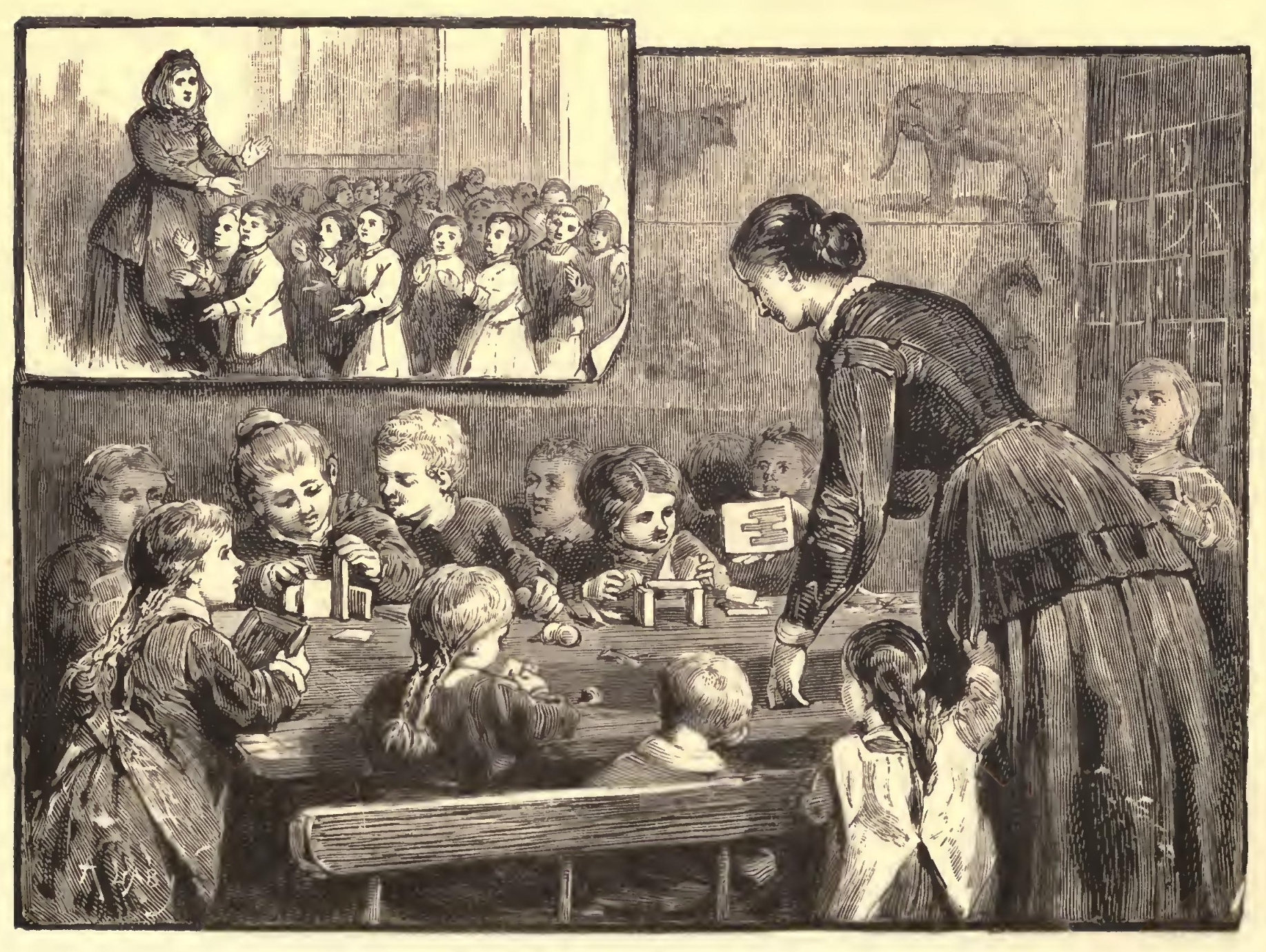 WHEN Toots was old enough to enter a little school, his mamma said he must go to a Kindergarten, which, you all know, is a delightful place for all children. Our good German friends first thought of it for their little people, and here in America we have found it an excellent fashion to follow. Block building, song singing, and drawing with pretty things in needlework, and forms in clay, not only teach the children to think but to do, and good thinking must always come before well doing, Toots' mamma knew a kind German lady who understood teaching the little ones, and after some delay a school was opened and Toots was a pupil. He cried hard at first. He was afraid of strangers, and he dreaded to speak aloud before them, although he was such a rogue at home. His mamma bought him a pretty lunch basket and put in it some little cakes for his lunch, and then they rode away in the horse car to the schoolroom. After the first day Toots was always ready to go. "It is only play," he said. But it was more than play, for every night Toots had something new to tell; sometimes he had watered the plants in the school-room, sometimes he talked of cubes and triangles, sometimes he sang a little song. Toots was learning without knowing it, and all the time he was very happy. No one was allowed to say a naughty word, no one was ever rude or unkind, and all the little eyes and hands were trained.