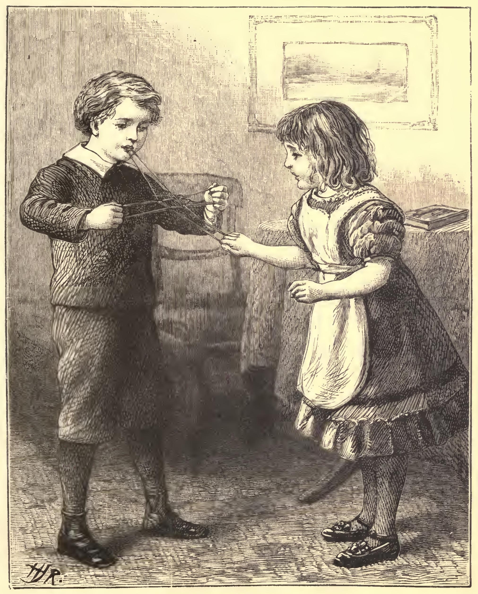 OOTS had a brother much older than himself, and never were two boys better friends. Nothing pleased Toots more than stories of his brother's pranks when he was small. Then Toots' parents travelled nearly all the time, and their eldest boy saw a great deal of this busy world. All the soldiers in his father's regiment called him "Button Blue," for when they first saw him he wore little dresses with a good many buttons on them. After that he had a jacket and pants, or, as he called them, "Bocker-nickers." He was a droll little fellow, and always managed to twist words about. The soldiers were very fond of Button, and made him many presents. They taught him games of all kinds, and here we see him showing the major's little daughter how to play cat's cradle.