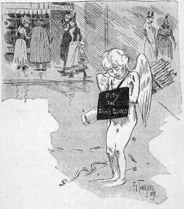 Lillie also painted a cynical picture of dubious double-edged incisiveness. It was called "Latter-day Love," and represented the ill hap of Cupid, neglected and superfluous, his quiver full, his arrows rusty, shivering with the [pg 18] cold, amid contented couples passing him by with never an eye for the lugubrious legend, "Pity the Poor Blind."