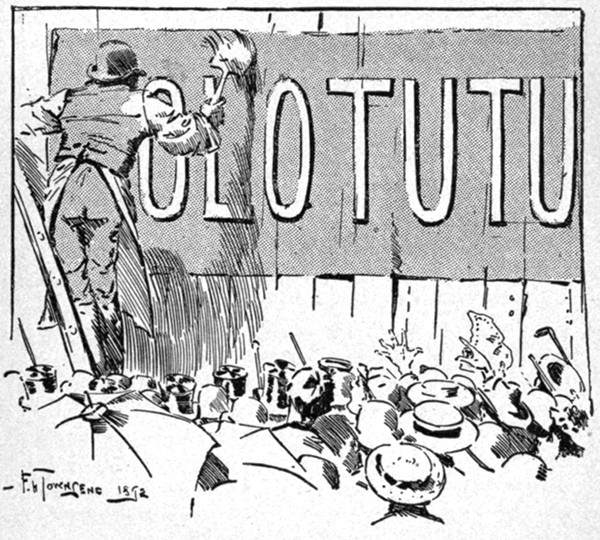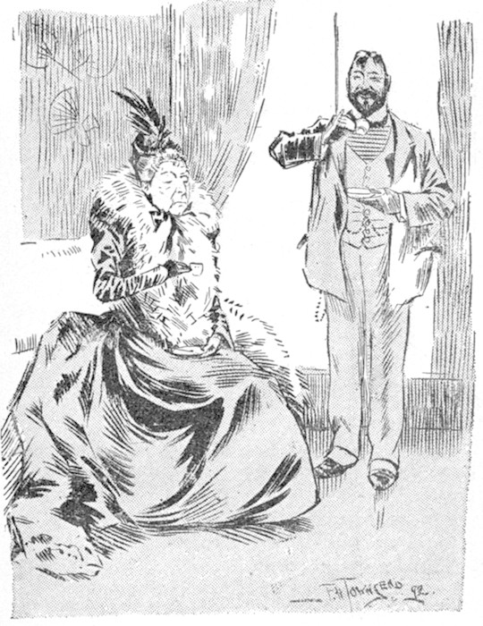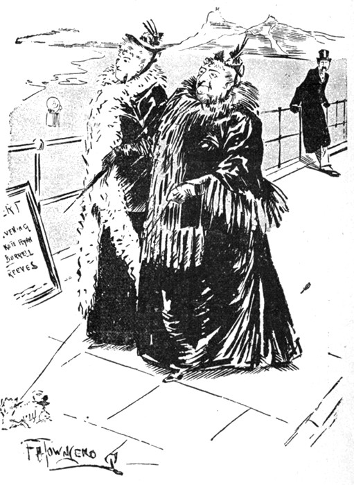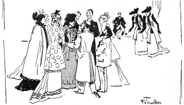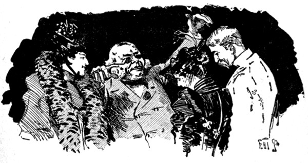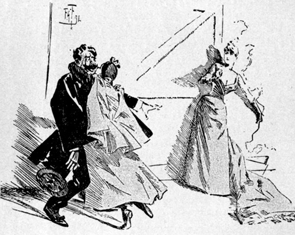 Besides the friends of the happy pair, nearly all the candidates were present at the inaugural soirée of the Old Maids' Club. Not quite all—because Lillie who was rapidly growing conventional did not care to have Clorinda Bell even accompanied by her mother, or by her brother, [pg 330] the Man in the Ironed Mask. Nor did she invite the twins, nor the osculatory Alice. But she conquered her prejudices in other instances, and Frank Maddox, the art critic, came under the convoy of the composer, Paul Horace, and Miss Mary Friscoe was brought by Bertie Smythe. The Writers' Club also sent Ellaline Rand, and an account of the proceedings appeared in the first number of the Cherub. The "Princess" was brought by Miss Primpole, and Captain Athelstan and Lord Arthur came together in unimpaired friendship. Eustasia Pallas and her husband, Percy Swinshell Spatt, both their faces full of the peace that passeth understanding, got a night off for the occasion and came in a hansom paid for out of the week's beer-money. Turple the magnificent, who had seen them at home in the servants' hall, was outraged in his deepest instincts and multiplied occasions for offering them refreshments merely for the pleasure of snorting in their proximity. The great Fladpick (Frank Gray), accompanied by his newly-won bride, Cecilia, made the evening memorable by the presence of the English Shakespeare, Guy Fledgely brought Miss Sybil Hotspur, and his father, the baronet, was under the care of Miss Jack. The lady from Boston wired congratulations on the success of the Club from Yokohama whither she had gone to pick up lacquer-work. Poor Miss Summerson, the lovely May, and the victim of the Valentine were a triad that was much admired. Miss Fanny Radowski, whose Oriental loveliness excited much attention, came, with Martin. Winifred Woodpecker was accompanied by her mother, the resemblance between the two being generally remarked, and Miss Margaret Linbridge seemed to afford Richard Westbourne copious opportunities for jealousy. Even Wilkins was there with his Diana, in an unprofessional capacity, Lillie having relented towards her interviewer on learning that she had been really engaged to Silverplume once and that she had not [pg 331] entirely drawn on the stores of journalistic fancy. Silverplume himself was there, unconscious to what he owed the invitation, and paying marked attention to the unattached beauties. Miss Nimrod promenaded the rooms on the arm of the millionaire. She had improved vastly since she had become effeminate, and Lillie felt she could put up with her, now she would not have to live with her. Even Silverdale's aunt, Lady Goody-Goody Twoshoes could find no fault with Nelly now.
