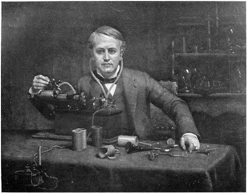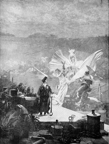 The above symbolic picture, after the master painting of Paul Sinibaldi, explains the secret of the wonderful progress of the past 100 years. The genius of Industry stands in the centre. To her right sits Chemistry; to the left the geniuses of Electricity with the battery, the telephone, the electric light; there also are the geniuses of Navigation with the propeller, and of Literature and Art, all bringing their products to Industry who passes them through the hands of Labor in the foreground to be fashioned for the use of mankind.