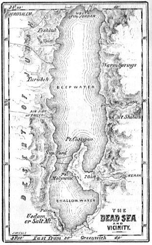 The information which the Christian world obtained in respect to the Dead Sea and the character of the country around it, was, after all, down to quite a late period, of a very vague and unsatisfactory character, being derived almost entirely from the reports of occasional travelers who approached the shores of it, from time to time, at certain points more accessible than others, but who remained at their places of observation for so brief a period, and were so restricted in respect to their means and facilities for properly examining the localities that they visited, that, notwithstanding all their efforts, the geography and natural history of the region were very imperfectly determined. Things continued in this state until the year 1847, when Lieutenant Lynch, of the United States naval service, made his celebrated expedition into the Holy Land, for the express purpose of exploring the River Jordan and the Dead Sea. We have already, in our article on the River Jordan, given an account of the landing of this party at the Bay of Acre, of their extraordinary journey across the country to the Sea of Galilee, and of their passage down the Jordan in the metallic boats, the Fanny Mason and the Fanny Skinner, which they had brought with them across to the Mediterranean. We now propose to narrate briefly the adventures which the intrepid explorer met with in his cruise around the Dead Sea. When he commenced the undertaking, it was considered both by himself and his companions, and also by his countrymen and friends at home, to be extremely doubtful whether he would be able to accomplish it. All previous attempts to navigate the sea had failed, and had proved fatal to their projectors. Some had been destroyed by the natives—others had sunk under the pestiferous effects of the climate. When, therefore, the boats of this party, heavily laden with their stores of provisions and their crews, came from the mouth of the Jordan out into the open sea, the hearts of the adventurous navigators were filled with many forebodings.