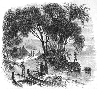The boats proceeded onward in this manner till night, and then rounding a point which was covered sparsely with bushes and trees, and with tufts of cane and grass, they came into a little bay which opened to a dell, fertilized by a fountain. The name of the fountain was Turabeh. Flowers were growing here, and certain fruits, the sight of which gladdened the eyes of our voyagers, though in any other situation they would have attracted little attention. The stream which sustained this vegetation was extremely small. The water trickled down from the spring so scantily that the Arabs were forced to dig holes in the sand, and wait for them to fill, in order to procure enough for drink. Still its influence was sufficient to clothe its narrow dell with something like verdure and fruitfulness. The little oasis had its inhabitants, too, as well as its plants and flowers. One of the party saw a duck at a little distance from the shore, and fired at her; though it might have been thought that no one could have had the heart to disturb even a duck in the possession of so solitary and humble a domain. In fact, it seems the sportsman must have had some misgivings, and was accordingly not very careful in his aim, for the bird was not harmed by the shot. She flew out to sea a little way, alarmed by the report, and then alighting on the glassy surface of the water, began to swim back again toward the shore, as if thinking it not possible that the strange intruders into her lonely home, whoever and whatever they might be, could really intend to do her any harm.