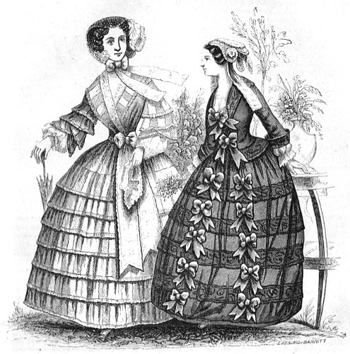 This is a pleasant season for traveling, after the equinoctial storms have passed by. Appropriate dresses are very desirable. None is more so than the foulard dress of a dark color, with branches of foliage and large bouquets of flowers. The same may be said of valencia and poplin de laine, either with Albanese stripes on a plain ground, or a large plaid pattern. A traveling dress should be made like a morning gown, but not exactly; for strings are put in underneath, both before and behind, for the purpose of drawing it, so as to form a pretty plaited body when they are pulled tight. Over the gathers either a ribbon or a band with a buckle must be added. The body may be either low or high, with a small collar having two rows of cambric plaited very fine, or with a jaconet collar having open plaits, or again with a Charles V. collar, made of frieze well starched and lustred. The under sleeves should be always in harmony with the collar.