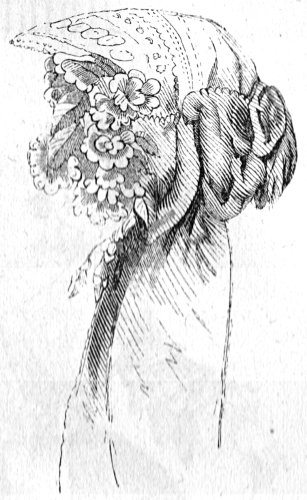 The bonnet is made half of straw, half of taffeta. The brim is straw veined with black or mixed with aloes, and the crown has a soft top of ruffled taffeta, with a bow of ribbon. On this capote, it is indispensable to put a Cambrai lace vail, that lace being at once substantial, light, and rich in pattern.