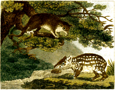 From inspecting the form of the feet it is easy to perceive that he walks and runs aukwardly; [247] it is said a man can overtake him without hastening his steps. He climbs up trees with great facility, hides himself in the leaves to catch birds, or hangs by the tail, the extremity of which is so muscular and flexible that he can clasp with it any thing he seizes upon. He sometimes remains a long while in this situation, his body suspended, with his head hanging downward, waiting for his prey. At other times he jumps from one tree to another, as the monkeys, with like muscular flexible tails, which he resembles also in the conformation of his feet. Though carnivorous, and even greedy of blood, which he sucks with avidity, he feeds also upon reptiles, insects, sugar-canes, potatoes, roots, and even leaves and bark of trees. He may easily be rendered a domestic animal, for he is neither wild nor ferocious; but he creates disgust by his smell, which is more offensive than that of the fox; his figure is also forbidding, for his ears are like those of an ounce, his tail resembles that of a serpent, his mouth is cleft to the very eyes, his body appears always dirty, because his hair is neither smooth nor curled, and seems as if covered with dirt. His bad smell resides in the skin, for his flesh [248] is eatable. The savages hunt this animal by preference, and feed on his flesh heartily.