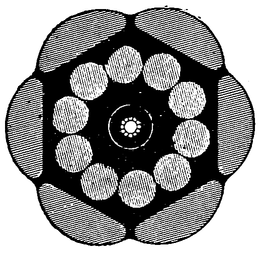 In 1894 yet two more additions were made to the list of Atlantic cables—one on behalf of the Commercial Cable Company, and the other for the “Anglo-American” Company. The new “Commercial” line was constructed and laid by Messrs. Siemens Brothers, and the “Anglo” cable by the Telegraph Construction Company. Fig. 43 shows the type adopted for the deepest water of the latter, and Fig. 44 that for the shore ends. Here the wires, besides being of a very large gauge, are applied with an extremely short lay (hence the elliptic appearance, though circular in reality), in order to increase the weight of iron, and thereby avoid shifting and abrasion. This type is now in constant use where rocks, ice-floes, strong currents, or rough weather are experienced. Special{217} arrangements were made in the design of both these cables to meet the requirements of increased speed. Since the successful application to submarine cables of various modifications of Wheatstone’s automatic transmitter, the limit to the speed attainable only depends, practically speaking, upon the type of cable employed. On these principles the core of the new “Commercial” cable was composed of a copper conductor weighing 500 pounds per nautical mile, covered with a gutta-percha insulating-sheath weighing 320 pounds per nautical mile, while the new “Anglo” has a core with conductor weighing 650 pounds per nautical mile, and gutta-percha insulator 400 pounds per nautical mile, involving a completed cable (main type) nearly double the weight of previous corresponding lines.