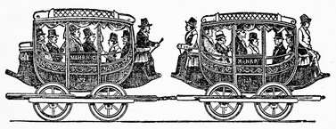The stagecoach was established in England as a public conveyance early in the sixteenth century, and soon regular routes were developed throughout the country. Now for the first time a closed vehicle afforded travelers comparative comfort during their journey, and in the stagecoach with its definite schedule may be seen the early prototype of the modern passenger railroad. For three centuries the stagecoach slowly developed, and its popularity carried it to the continent and later to America. But by a radical invention transportation was suddenly transformed.