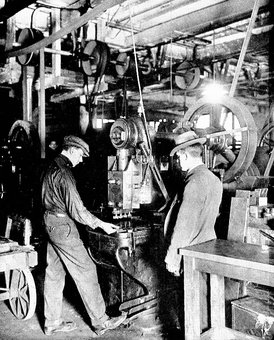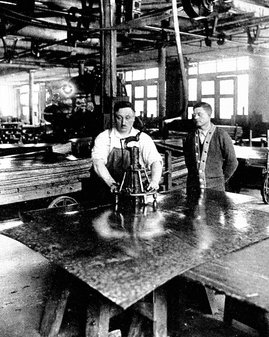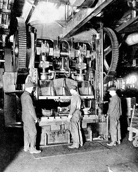 This great power press is engaged in shaping the steel panelling for the inside finish of the car